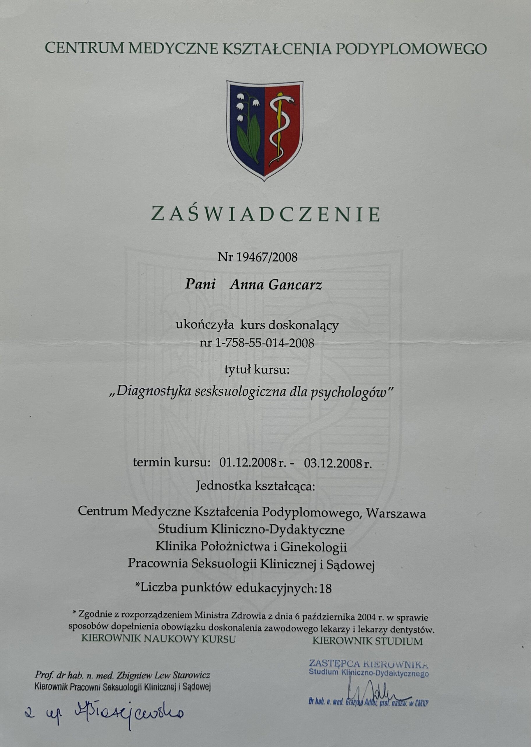 Psychoterapeuta poznawczo-behawioralnym CBT w trakcie 4-letniej certyfikowanej Szkoły Psychoterapii Poznawczo-behawioralnej.
